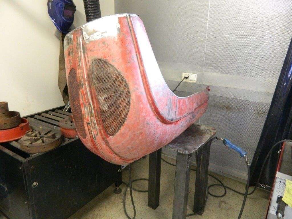 Die hier abgebildete Motorhaube bereitete besondere Schwierigkeiten, da die eingeschweißten Bleche teilweise in eine runde Form gebracht werden mussten und so bearbeitet wurden, dass sie nach ihrer Fertigstellung exakt in die vorgesehene Position über dem Motorblock passen muss.