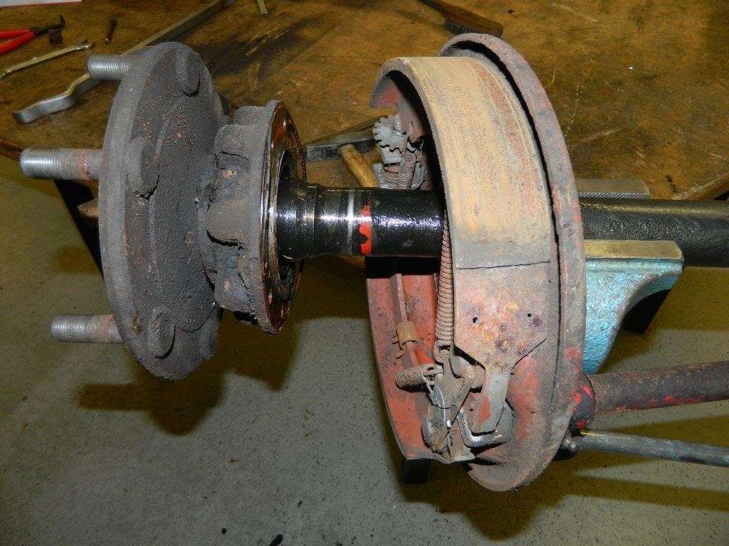 Auf dem nächsten Bild ist die Steckachse mit der Radnabe und die geöffnete Bremstrommel zu sehen, die an einem Schraubstock fixiert, entrostet und gängig gemacht werden soll. Darüber hinaus mussten hier neue Dichtungen eingesetzt werden.