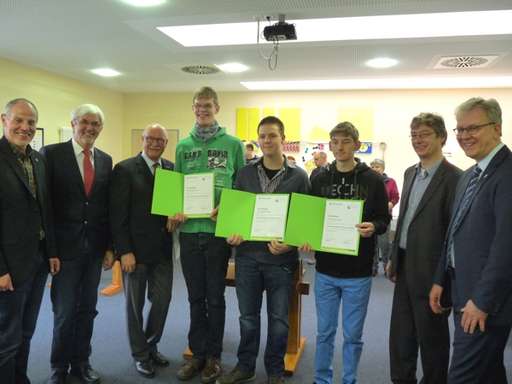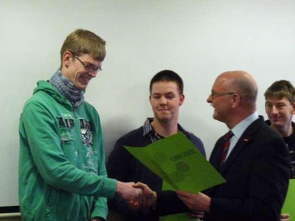 Wenn sich der Präsident der Handwerkskammer Osnabrück, Emsland und Grafschaft Bentheim auf den Weg macht, um eine Zertifikatsübergabe zum Abschluss einer beruflichen Qualifizierung in Werkstätten zu übernehmen, ist das ein Zeichen besonderer Würdigung“, dankte Vitus Geschäftführer Michael Korden dem HWK-Präsidenten Peter Voss für seinen Besuch. Seit Mitte letzten Jahres werden durch Vitus Menschen mit Behinderung zum Handwerksgehilfen qualifiziert. Am 13.2.2015 wurden in Anwesenheit zahlreicher Gäste die ersten Zertifikate an drei junge Handwerksgehilfen im Bereich Metall in einer kleinen Feierstunde übergeben und dabei gleichzeitig auch die Arbeiten des Trägers zur Etablierung dieser Qualifizierung gewürdigt: „Dies ist eine Eintrittskarte in die Arbeitswelt und die Teilhabe an gesellschaftlicher Anerkennung“ sagte der Präsident der Handwerkskammer Peter Voss. Die drei Handwerksgehilfen berichteten von der Zeit im Berufsbildungsbereich, der Prüfung sowie ihren Plänen für die Zukunft.