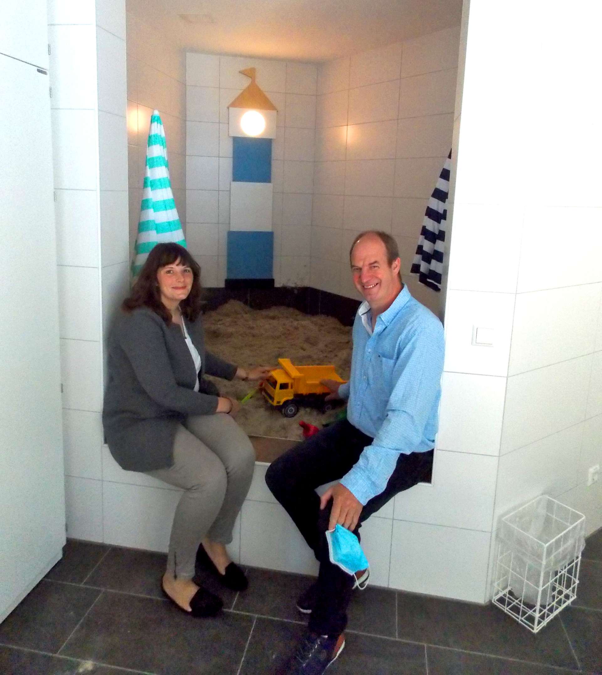 Zum Schluss wurde noch eine Führung durch die neue KiTa angeboten. Begeistert durchquerten die beiden Vertreter Raum für Raum und Sandhaus bestätigte: „Der Kindergarten lässt keine Wünsche offen.“ Am hauseigenen Indoor-Matschraum fand auch Brüggen gefallen: „Da wäre ich gerne wieder Kind!“