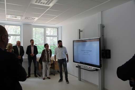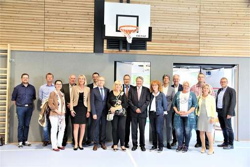 „Die jahrelange Container-Lösung hat damit nun ein Ende und das Förderangebot zur körperlich-motorischen Entwicklung der Schülerinnen und Schüler kann mit einer eigenen Bewegungshalle deutlich verbessert werden.“ „Rund 2,3 Mio Euro hat der Landkreis Emsland in diese Erweiterung investiert“, erläuterte Landrat Reinhard Winter, was angesichts der konstant hohen Schülerzahlen der letzten Jahre dem Bedarf angemessen sei. Bei einem Rundgang konnten die Teilnehmer die neuen Klassenräume, ausgestattet mit digitalen Boards der neuesten Generation, Differenzierungs- sowie Therapieräume sowie die Bewegungshalle in Augenschein nehmen. „Nach den Sommerferien werden wir hier den Schulbetrieb aufnehmen“, kündigte Birgit Isegrei an und bedankte sich für die Unterstützung.