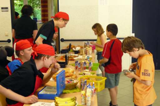 Wer seine Pausenbrote zu Hause hat liegen lassen, kann seinen leeren Magen mit dem umfangreichen Sortiment des Schulkiosks „Schmackofatz“ füllen. Jeden Freitag gibt es dort leckere frischbelegte Brötchen, Obst, Getränke, kleine Süßigkeiten und vieles mehr. Zuständig für den Kiosk ist die Projektgruppe „Hauswirtschaft“. Selbstständig erledigen die Schülerinnen und Schüler alle dazu gehörigen Arbeiten: Einkaufslisten erstellen, Preisvergleiche, Gestaltung des Verkaufsstandes, Abrechnungen, Brötchen schmieren, Verkauf, Organisation des Verkaufes etc. – eine Aufgabe, ganz gemäß dem Grundsatz: Für das Leben lernen!