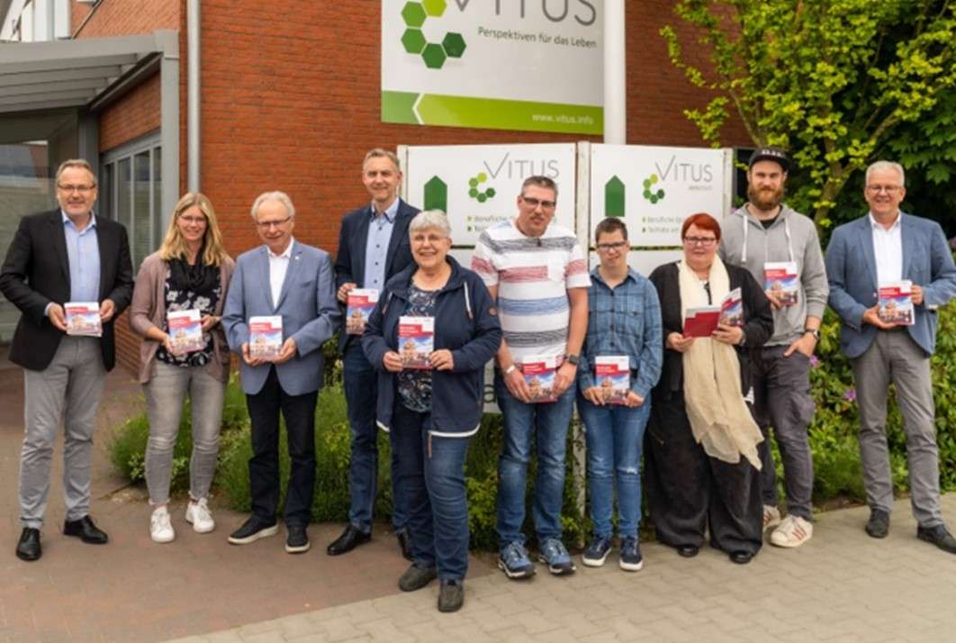 „Was lange währt, wird endlich gut“, erklärte Maria Brüggemann, Mitglied der Arbeitsgruppe, bei der offiziellen Vorstellung des inklusiven Stadtführers im Schulungsraum der Vitus Werkstatt in Meppen. Eine Gruppe aus Ehrenamtlichen des Angehörigen- und Förderverein pro Vitus e.V und hauptamtlichen Vitus Mitarbeitenden war maßgeblich an der Idee und Entstehung des inklusiven Stadtführers beteiligt. Mit der Idee sei man bereits 2013 gestartet. Schnell wurde deutlich, dass man weitere Seiten, wie die Stadt Meppen und die Tourist Information Meppen miteinbeziehen musste, um die Projektidee zu verwirklichen. Mit dem SoVD fand man schließlich den richtigen Partner, um dieses umfangreiche Projekt umzusetzen.
