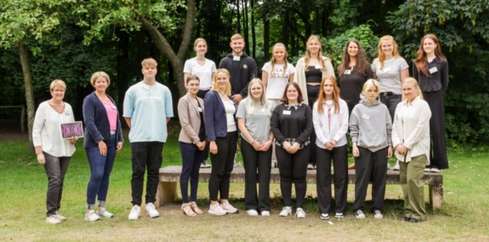 Seit 2021 unterstützt Vitus in Kooperation mit der Marienhausschule Auszubildende der Heilerziehungspflege (HEP) mit dem Vitus Stipendium. In diesem Jahr können sich 22 engagierte BerufseinsteigerInnen über ein Stipendium freuen. Bei einer Zeremonie im Café Koppelschleuse in Meppen wurden diese nun feierlich übergeben. Beglückwünscht wurden sie dabei von Helga Magdanz, Fabienne Börjes und Ellen Hemker von Vitus sowie Inis Elsen-Wübbels als Vertreterin der Marienhausschule, die das Stipendium und das Thema HEP-Ausbildung allgemein in enger Kooperation betreuen.