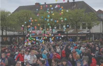 Bevor „Shit Happens“ abschließend in die Gitarrensaiten griff, stiegen 499 bunte Luftballons in die Lüfte - der Aktionstag in Lingen und das Anliegen der Veranstalter, „gemeinsam Vielfalt zu leben“, sollte niemandem verborgen bleiben.