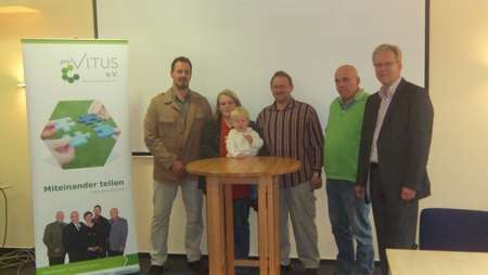 Bei einem Gewinnspiel galt es, die aktuelle Zahl der Mitglieder des pro Vitus e.V. (283) zu schätzen. Frau Natascha Kater aus Haselünne war mit ihrer Schätzung (284) am dichtesten dran. Sie und Ihre Familie freuten sich sehr, als sie jetzt den Preis - einen Stehtisch aus Buchenholz, angefertigt in der Vitus Werkstatt -entgegennehmen konnten. Vorstandsmitglieder Manfred Möller und Franz Kuhlmeyer sowie Vitus Geschäftsführer Michel Korden beglückwünschten Natascha Kater mit Ehemann Andreas und Sohn Simon zu ihrem Gewinn.