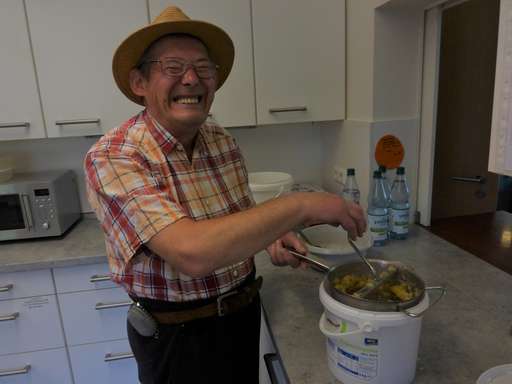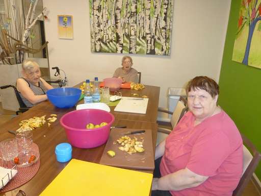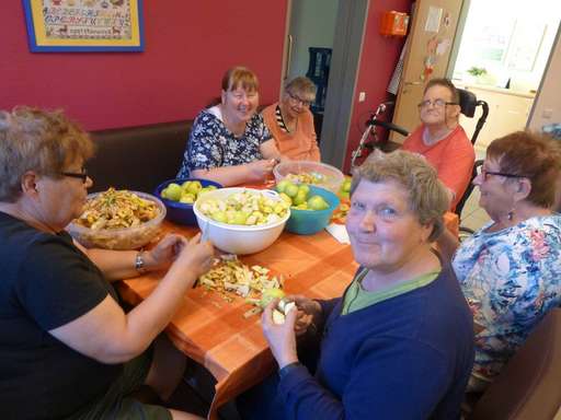 Bei lauter Schlagermusik wurde geschnibbelt, gekocht, püriert und natürlich gequatscht und gesungen. Nach einigen Stunden war dann so mancher Eimer und Sack verarbeitet und die „Flotte Lotte“ heiß gelaufen.