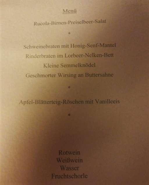 Zu diesem Anlass wird immer ein besonderes 3-Gänge-Menü mit viel Phantasie ausgewählt, probegekocht, umdisponiert, neu probiert, um dann an diesem Abend serviert zu werden.