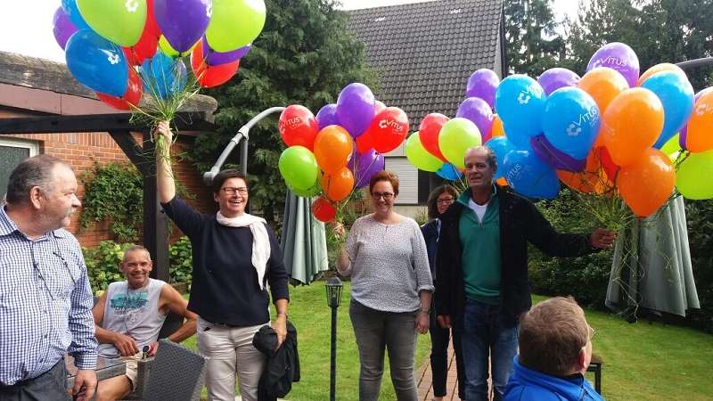 An insgesamt sechs Standorten wurde der Auftakt zu unserem 50jährigen Jubiläum mit viel Freude und gemeinsamen Aktionen gefeiert: Im Garten der Grünen Oase trafen sich Mitarbeiter und Kunden des Ambulant Betreuten Wohnens, des Haus Deichstraße und der Außenwohngruppen sowie des Familienentlastenden Dienstes. Die Wohnanlage St. Vitus feierte den Tag mit dem Jubiläumsflashmob und Kaffee und Kuchen. Die Wohnanlage Helter Damm verband dieses Ereignis mit ihrem 20jährigen Jubiläum und feierte in großer Runde mit allen Mitarbeitern, Bewohnern, Angehörigen und Freunden. Auch die Bewohner und Mitarbeiter der Wohnanlagen St. Josef und Rühlerfeld sowie der Wohngruppe im Haus Margarete standen startklar mit Luftballons in der Hand und warteten auf den Countdown. Um Punkt 15.50 Uhr konnten dann dank einer großzügigen Spende der Firma Wocken von vier großen Flaschen Heliumgas über 400 Luftballons in allen Farben starten - begleitet von fröhlichen Zurufen und buntem Trubel. So gestartet geht es hoch motiviert in das Jubiläumsjahr „50 Jahre bunte Vielfalt“!