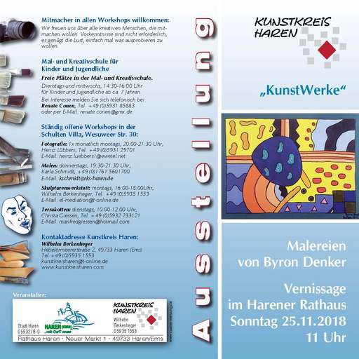 Byron Denker, Bewohner der Wohnanlage Twist, stellt einige Kunstwerke seines aktuellen Kataloges, sowie alte Werke im Rathaus Haren aus. Ausstellungsstart ist der 25.11.2018 um 11:00 Uhr. Der Eröffnungstag wird durch Gerd Zimmer musikalisch untermalt. Ansonsten sind die Bilder für Interessierte zu den üblichen Geschäftszeiten des Rathauses zu bestaunen.