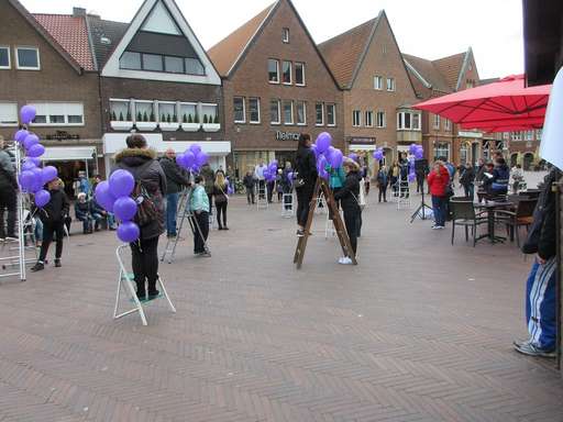 Das Katholische Jugendbüro Emsland-Mitte hat in der Fastenzeit unter der Überschrift #countdown regelmäßig kurze Impulse, in der Auseinandersetzung mit dem Kreuzweg Jesu, an etwa 1.200 angemeldete Teilnehmer verschickt. Am Karsamstag gab es eine Aktion auf dem Meppener Marktplatz, an der sich auch Bewohner aus unserer Wohngruppe beteiligt haben. Ausgerüstet mit Leitern an denen Luftballon befestigt waren, sind wir mit anderen Jugendlichen aus dem Dekanat Emsland-Mitte auf den Marktplatz gezogen. Das Lied „Wann reißt der Himmel auf?“ das unsere Aktion begleitet hat, und das gleichzeitige Erklimmen der Leitern, sollte den Zustand des „Zwischen Himmel und Erde, des Hoffens und Wartens“ am Tag vor dem großen freudigen Fest unseres christlichen Glaubens, der Auferstehung, den Sieg über den Tod, versinnbildlichen. Unter der Fragestellung was bedeutet für dich Glück, hatten alle Besucher die Möglichkeit ihre Gedanken auf Karten zu schreiben, die dann an die Luftballon gebunden wurden und im Abschluss unter Aufzählung des Countdowns gemeinsam in den Himmel geschickt wurden. Die Aktion wurde von mehreren hundert Besuchern begleitet, und hat trotz typischer „Aprilwetterlage“ sehr viel Spaß gemacht. Am Schluss ist dann sprichwörtlich der „Himmel aufgerissen“ und die Sonne lachte durch die Wolken.